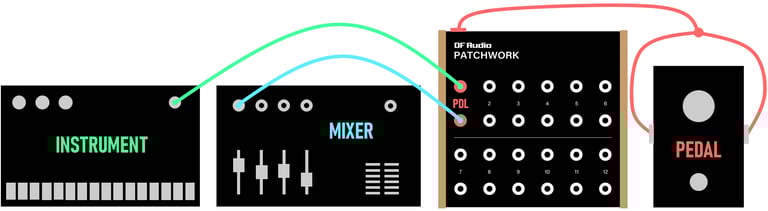 DIRECT PATCHING: If you have a mixer with 3.5 mm inputs (e.g. Cre8Audio Assembler), simply unplug an instrument from the mixer, patch straight into the PATCHWORK, and then into the input on the mixer. This is probably the most streamlined way to use a patch bay, with significantly less cabling required.