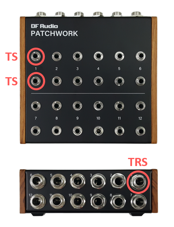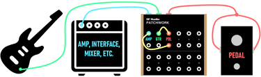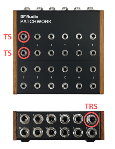 GUITAR: It's fine to plug a TS cable into any of the TRS sockets on the back of PATCHWORK, it just means that you lose the lower corresponding socket on the top panel as a patch point. Usually, it's easiest to have one dedicated socket on the back for guitar and another for your amp. But that still leaves you room for ten pedals to play with (and experiment with different signal chains)!